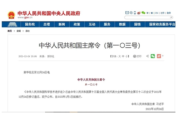 2021年12月24日,中華人民共和國第十三屆全國人民代表大會常務(wù)委員會第三十二次會議修訂通過了《中華人民共和國科學(xué)技術(shù)進(jìn)步法》。自2022年1月1日起施行。