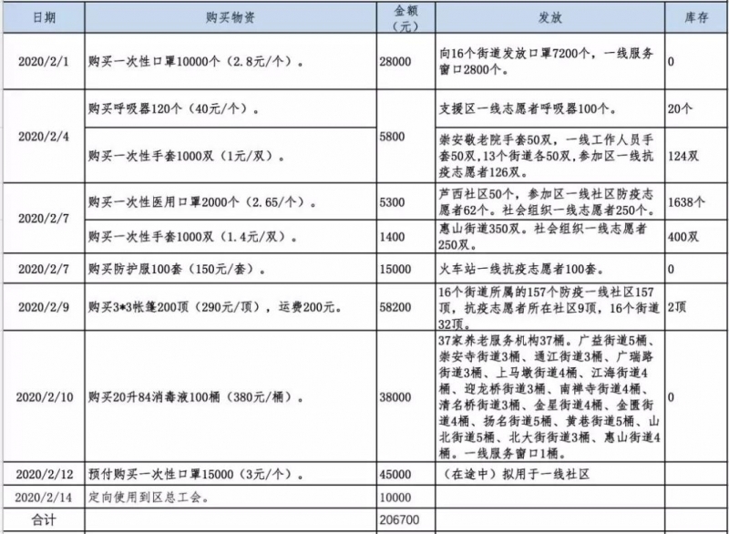 截至2020年2月14日17時,共接受捐贈資金55.1808萬元,支出20.67萬元,結余34.5108萬元。