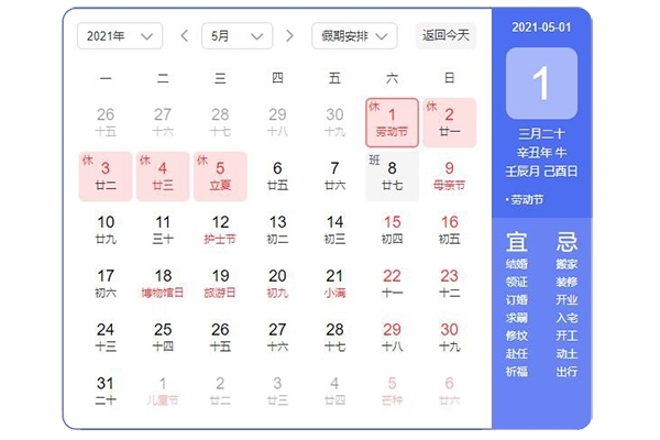 2021年5月1日-5月5日放假調(diào)休,共5天。5月8日(星期六)我們正常上班。節(jié)前各位同事安排好工作,配合行政做好清潔打掃工作,檢查好電源開關(guān),關(guān)好門窗。節(jié)日期間,請大家注意人身安全和財產(chǎn)安全,愉快的度過假期。