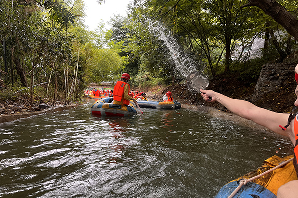 在享用豐盛的午餐后,午后,我們乘坐大巴車前往竹海漂流,迎接更為刺激的漂流活動。穿上救生衣,坐上漂流艇,我們仿佛化身成了勇敢的探險家。隨著水流的起伏,漂流艇時而飛速下滑,時而緩緩漂流,我們的心情也跟著起伏不定,既緊張又興奮。