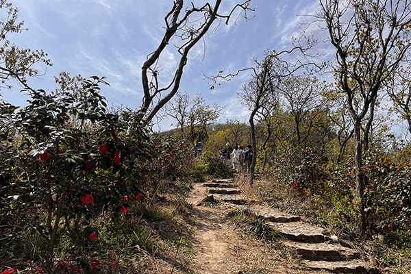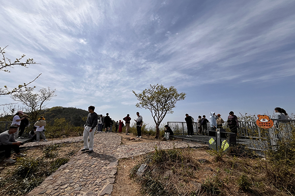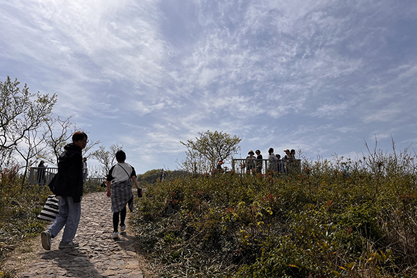 春風裹挾著草木的清氣,在耳畔絮語。天朗氣清,同事們身著輕便裝束,三三兩兩結(jié)伴而行,起初石階尚算平緩,還能輕松談笑。行至半路,領(lǐng)頭的幾個年輕人早已不見蹤影,中間的一撥走走停停,不時掏出手機拍照,或是扶著膝蓋喘幾口粗氣。落在后頭的幾位,索性尋了塊平整的石頭坐下,掏出水壺慢飲,倒像是在自家庭院納涼。