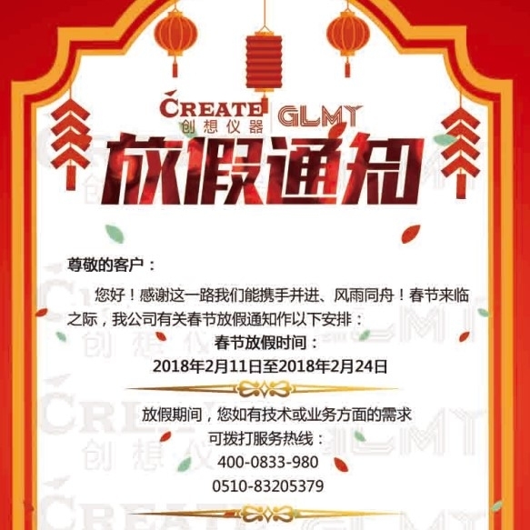 創想儀器2018年春節放假通知